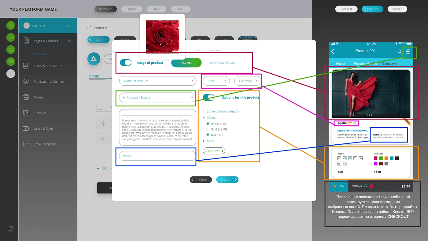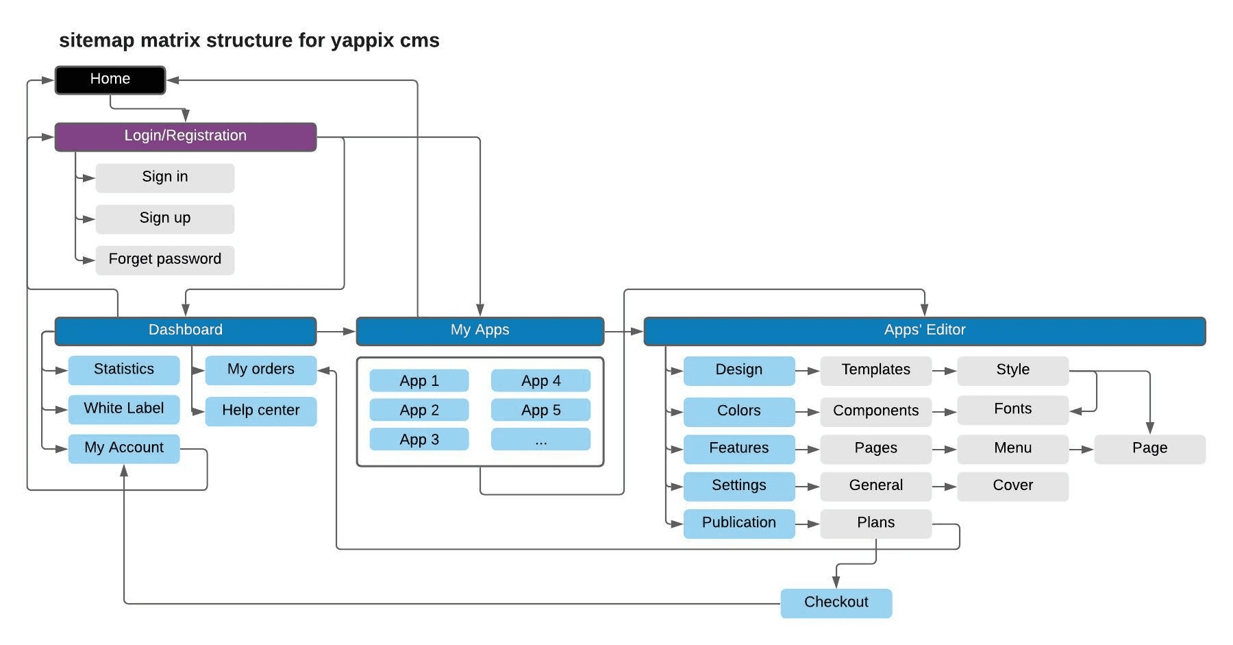 In 2018, a State Grant was received from the Innovation Promotion Foundation for the research phase. Thanks to the ideate phase, I got 2 groups of persons – an agency and a small entrepreneur. The study included Competitive Audit. Thus, having data on Problem Statements, I was able to create Goal Statements. Between the ideate and Prototype phases, I create User-flow and User-Journey map. Then my team and I revisited a number of hypotheses as trends change rapidly and new technologies are added. In 2019, we drew Storyboard (Big Picture) and Storyboard (Close-Up). Smoothly move on to Paper wireframes and then in the same month I create a Low-fidelity wireframe. Based on all this, I got an information architecture. Mid 2019 and I started the High-fidelity prototype. At the moment I am working on a redesign because I did a number of tests based on the UX Research Study Plan. In 2021, the development of the core of the platform began. I want to note that the project is under NDA and I am showing you only a stripped-down version and a very old design.